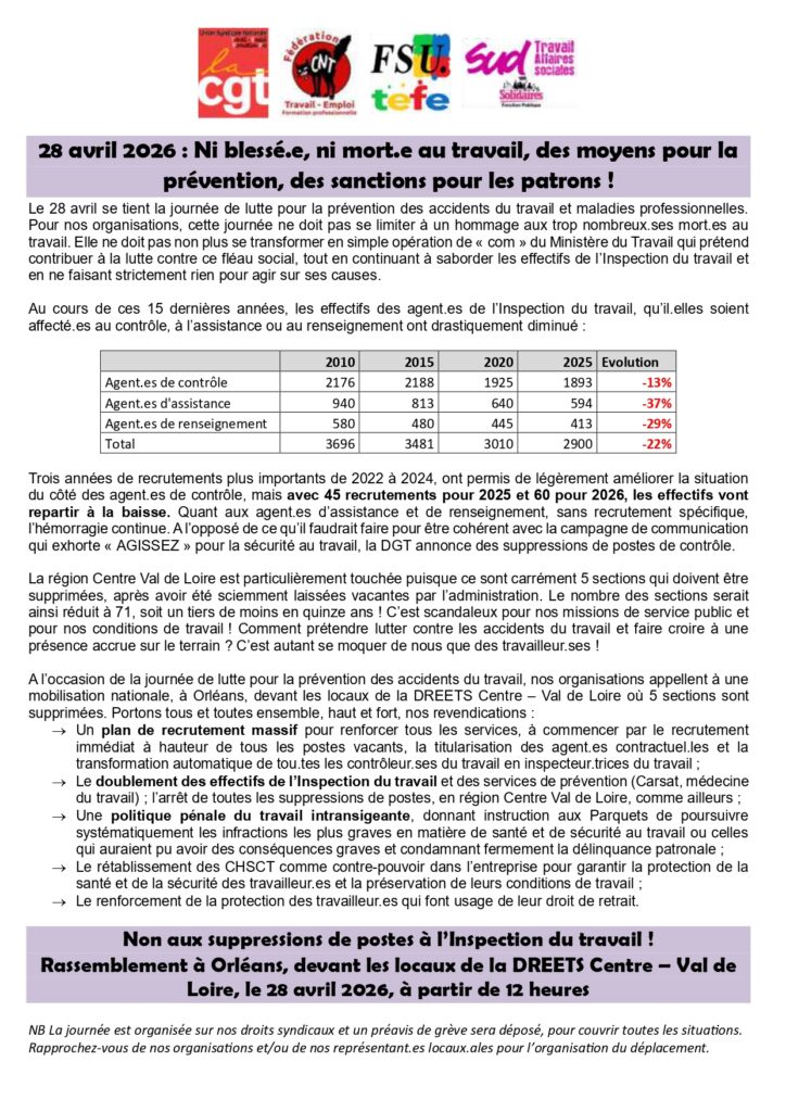 Rassemblement à Orléans, devant les locaux de la DREETS Centre – Val de Loire, le 28 avril 2026, à partir de 12 heures.