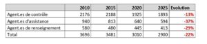Au cours de ces 15 dernières années, les effectifs des agent.es de l’Inspection du travail, qu’il.elles soient affecté.es au contrôle, à l’assistance ou au renseignement ont drastiquement diminué :
