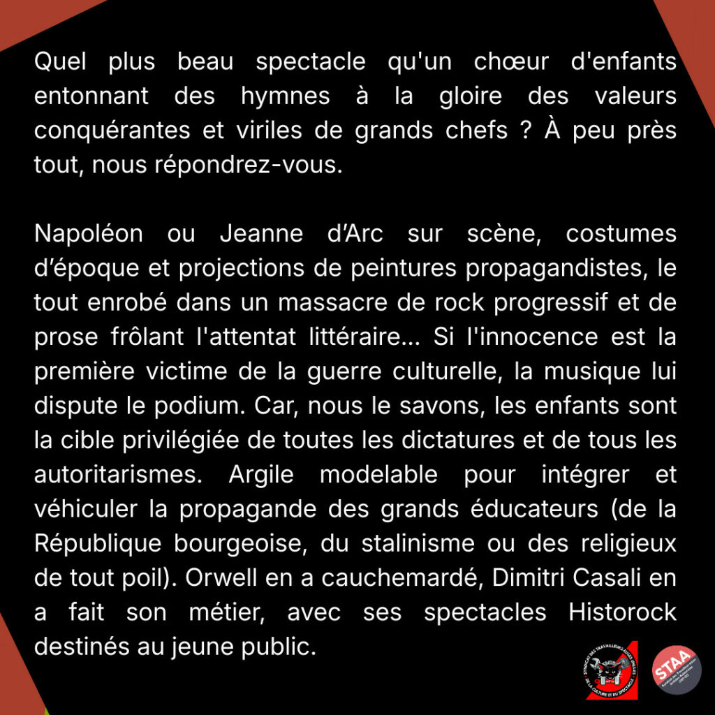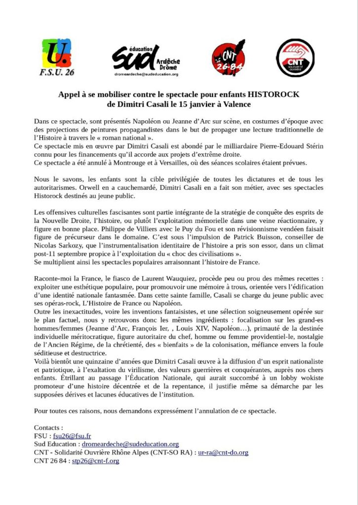 Parce que le spectacle pour enfants « Historok », s’inscrit dans la bataille idéologique que mènent les réactionnaires et l’extrême droite dans le champ culturel, nos organisations appellent à se mobiliser contre le spectacle organisé le 15 janvier au théâtre de la Ville de Valence.