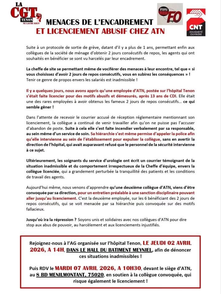 Depuis plusieurs années, les personnels de nettoyage du site de l’hôpital Tenon de l’AP-HP, se mobilisent pour faire avancer leurs droits, notamment avec la section syndicale CNT-SO. En face, l’encadrement du sous-traitant ATN joue la carte du management violent et de la répression avec déjà un premier licenciement abusif et une autre salariée convoquée pour un entretien disciplinaire. Hors de question de se laisser faire, la riposte intersyndicale s’organise sur l’établissement !