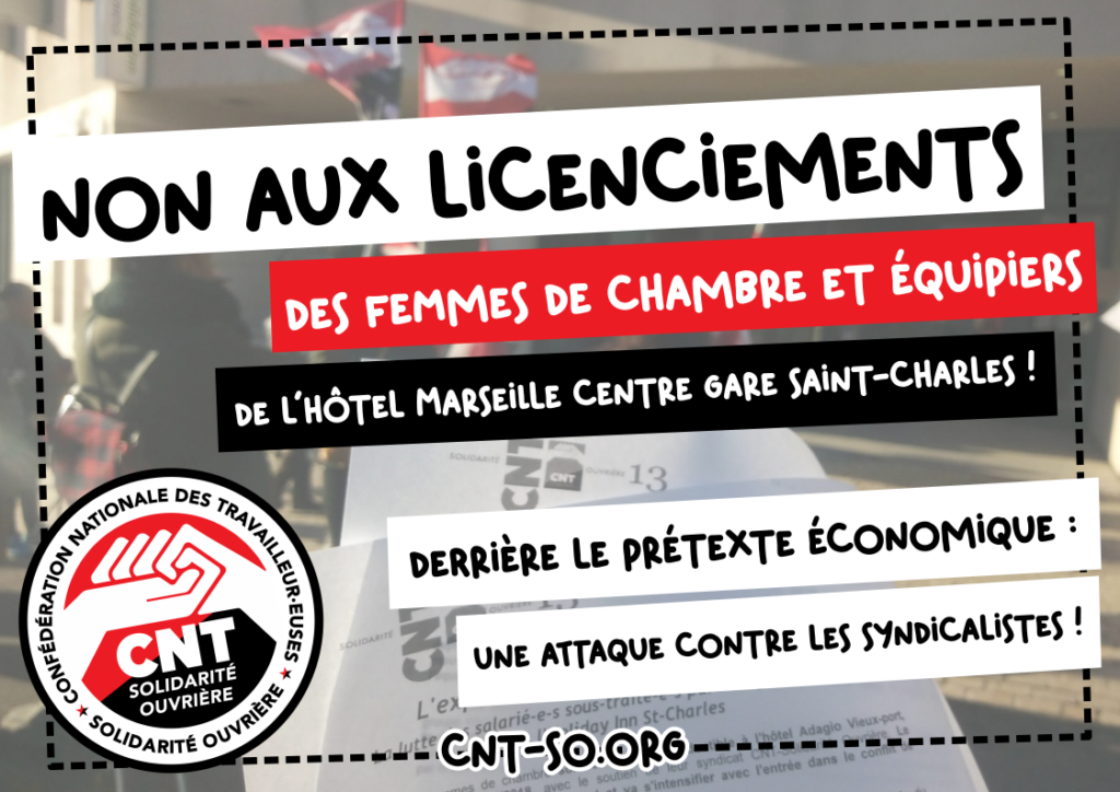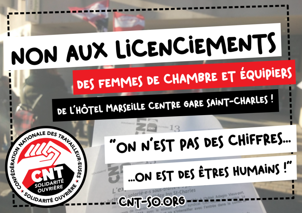 Face à la menace imminente de sept licenciements, les personnels de l’Hôtel Marseille Centre Gare Saint-Charles sont en grève lundi 29/12, et organisent un piquet bruyant devant l’hôtel. Leur slogan sera « On n’est pas des chiffres, on est des êtres humains ». L’ensemble des personnels ciblé-es par ces licenciements sont syndiqué-es à la CNT-SO, syndicat de combat, très actif dans les luttes menées par les personnels des hôtels marseillais depuis des années. Simple hasard ? Nous ne le pensons pas !
