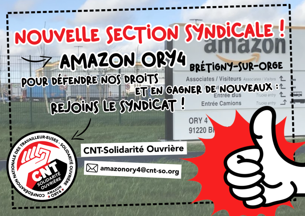La CNT-SO poursuit son développement dans les transports et la logistique avec la mise en place d’une section syndicale sur le site ORY4 de Bretigny-sur-orge (91), un des principaux entrepôts français d’Amazon.